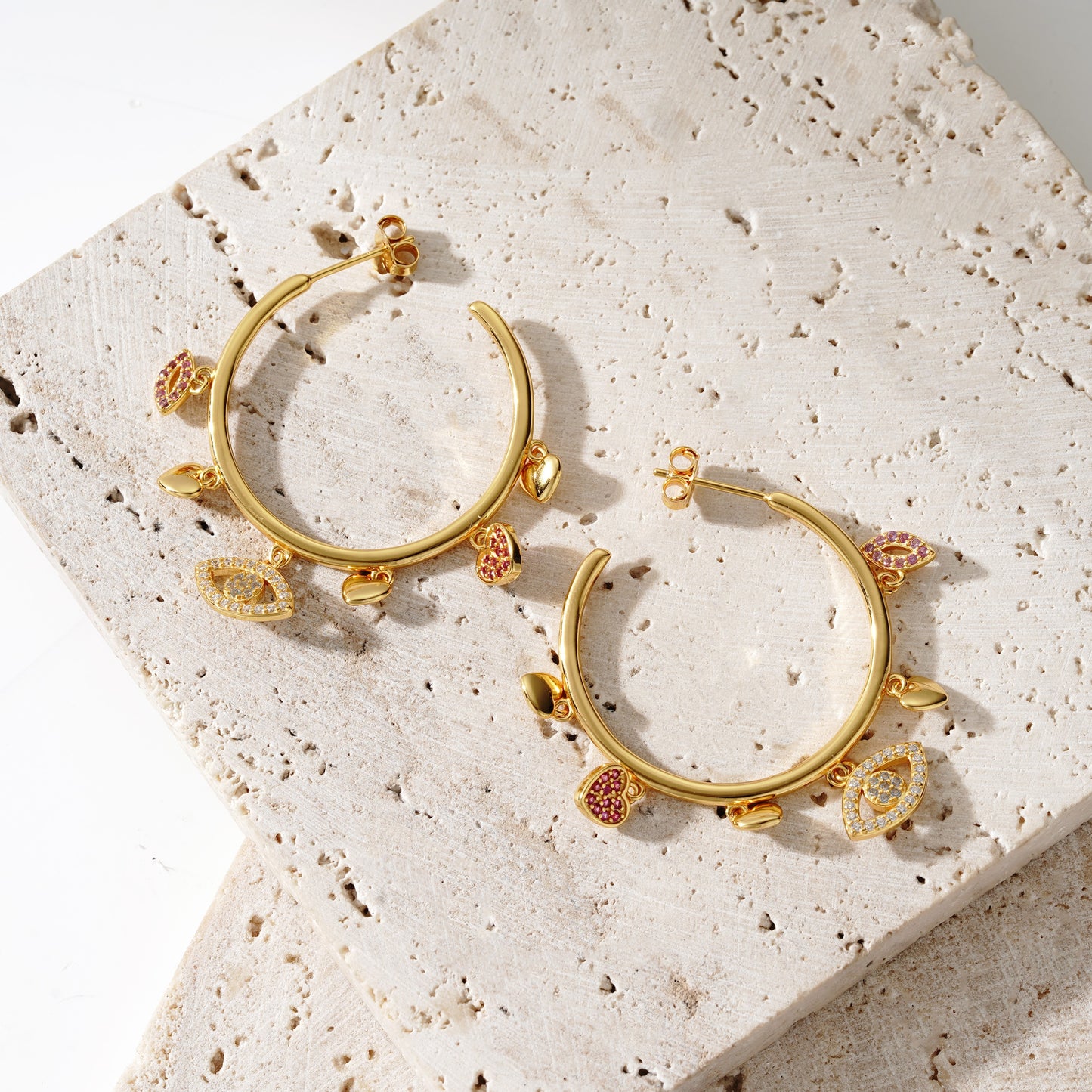 Our 18 karat gold plated evil eye charm hoops with dancing individual heart and lips charms are perfect for summer and party season Dazzle and delight with these stunning gold-plated hoops featuring intricate evil eye, heart, and lips charms that dance with every step. A must-have accessory for sunny days and unforgettable nights.